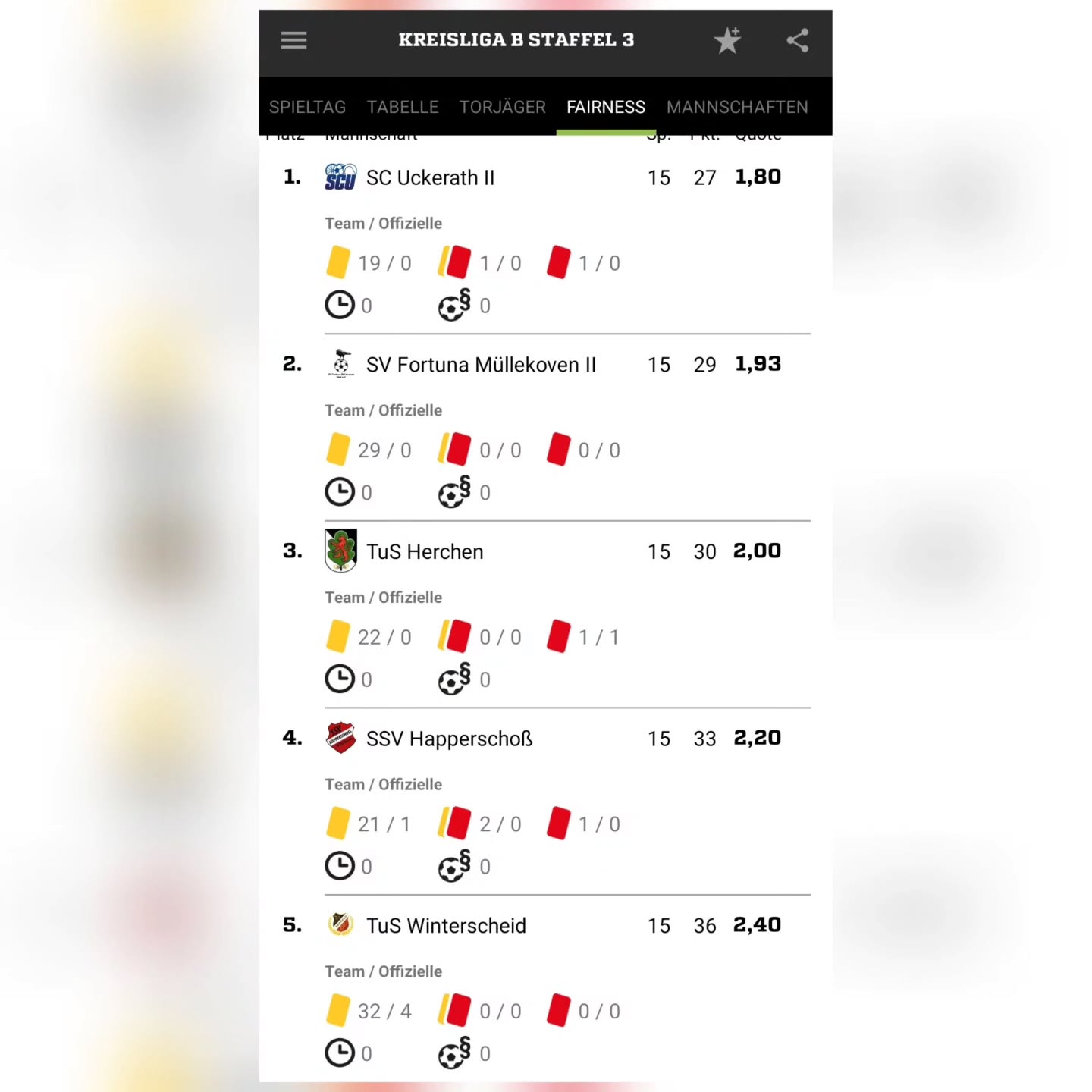 In der Fairnesstabelle liegen unsere Herren auf Platz 3' mit 22 gelben und zwei roten Karte.