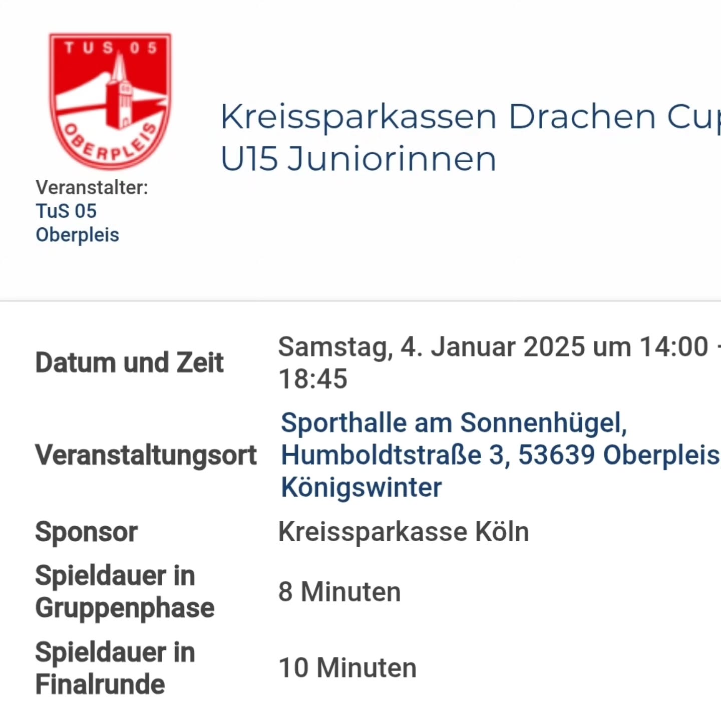 Am 4. Januar nahmen unsere C Juniorinnen am Drachen Cup des TuS Oberpleis teil. Bei diesem hochrangig besetzen Turnier trafen unsere Mädels in der Gruppe A auf den SC Bad Neuenahr, den SV Schwarz Weiß Schwanenberg, den Bonner SV Roleber und TuS Oberpleis 1. Mit leider nur einem Punkt ging es in der Finalrunde zum Spiel um Platz 9. Da der Gastgeber keine 2 Teams stellen konnte, wurde das Spiel mit 2:0 für den TuS Herchen gewertet. Im Finale setze sich übrigens Bad Neuenahr mit 2:1 gegen Schwanenberg durch.