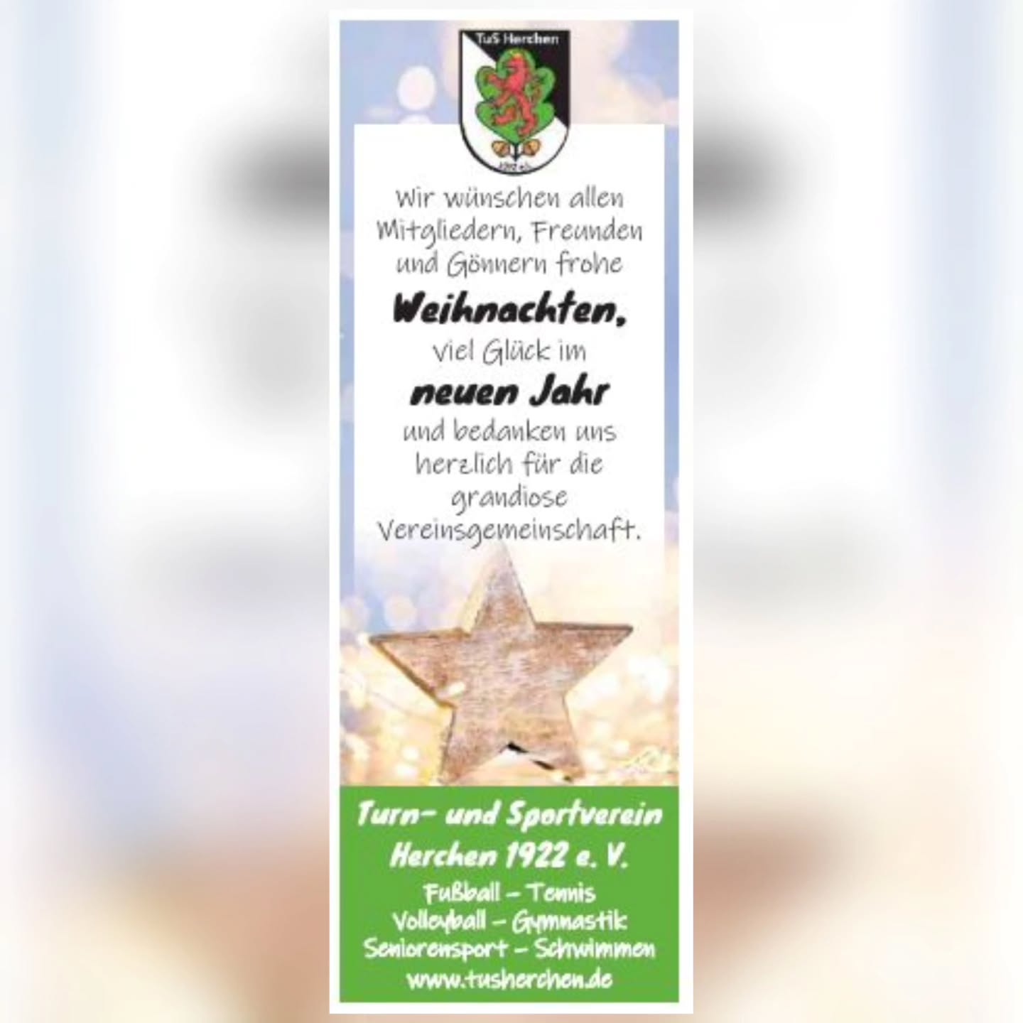 Wir wünschen allen Mitgliedern, Freunden und Gönnern frohe Weihnachten, viel Glück im neuen Jahr und bedanken uns für die grandiose Vereinsarbeit.